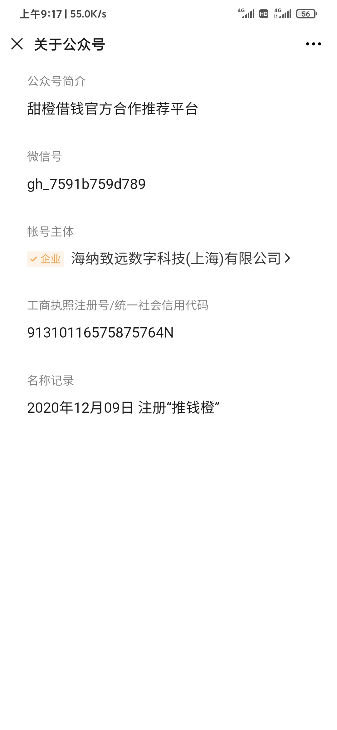 在推钱橙公众号的介绍中,我发现,它是甜橙官方合作推荐平台。另外,它的账号主体,是海纳致远数字科技(上海)有限公司。