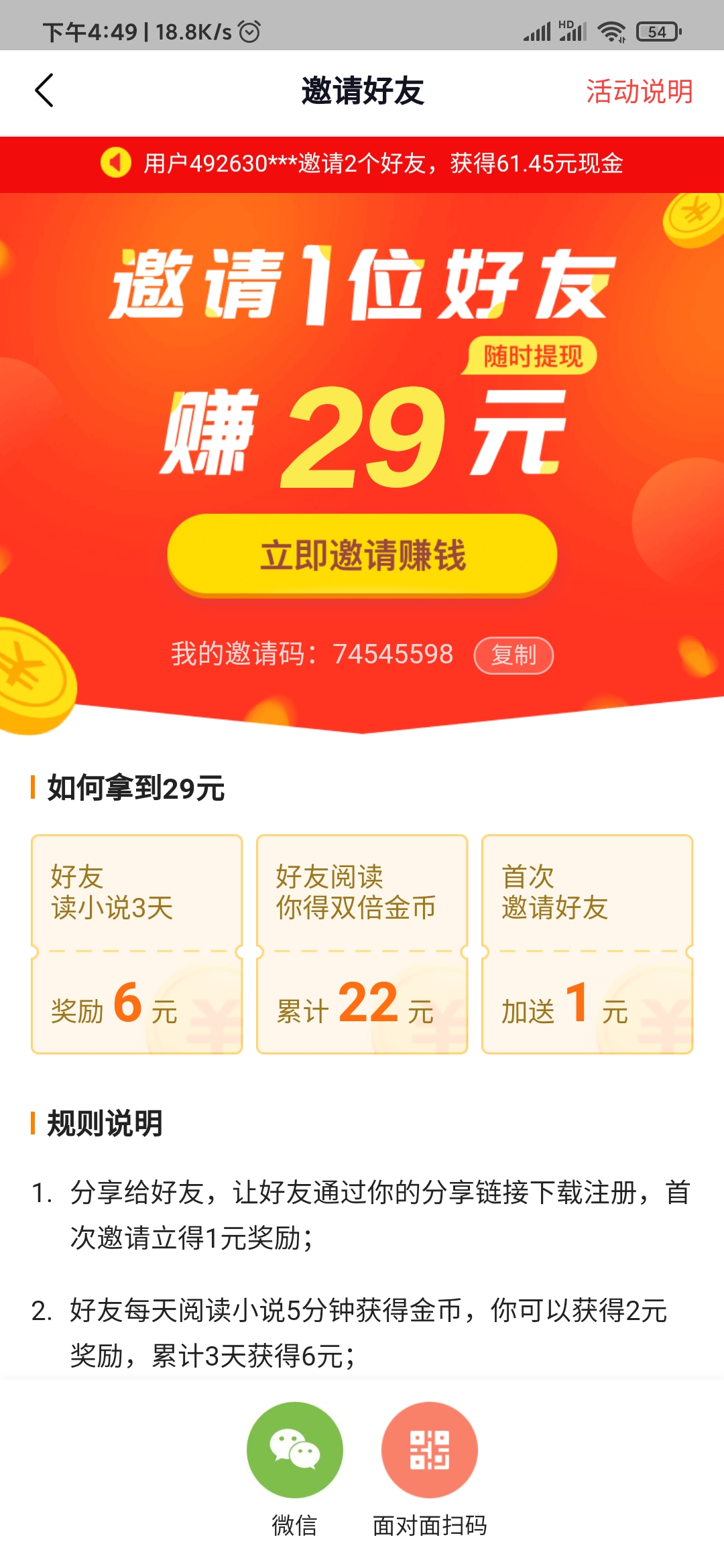 如果,将自己的番茄小说邀请码,分享给好友。好友填写,并使用软件。那么,自己能获得最高29元。这29元,是陆续获得的。