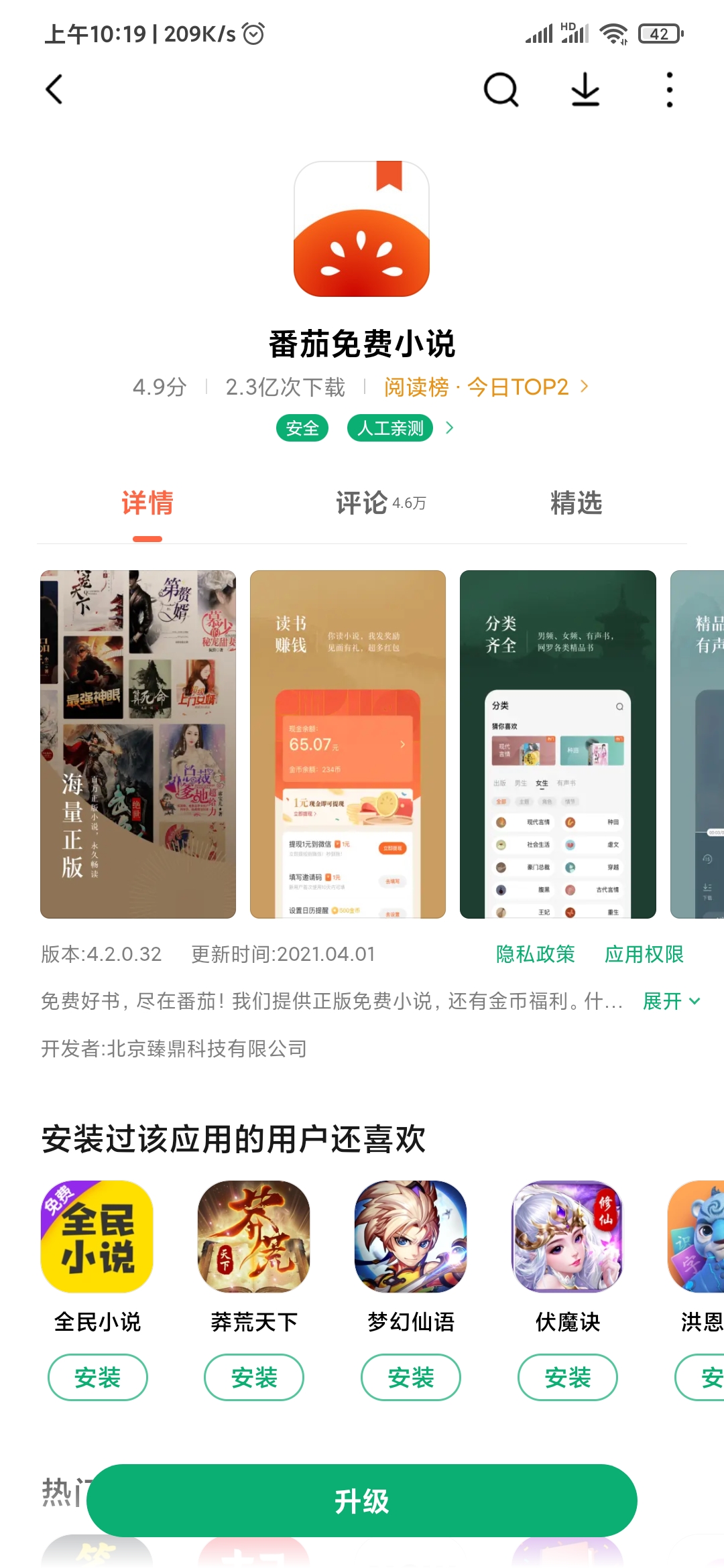 首先,我在应用商店,看见番茄小说的开发者,是北京臻鼎科技有限公司。在小米应用商店,名称是番茄免费小说;