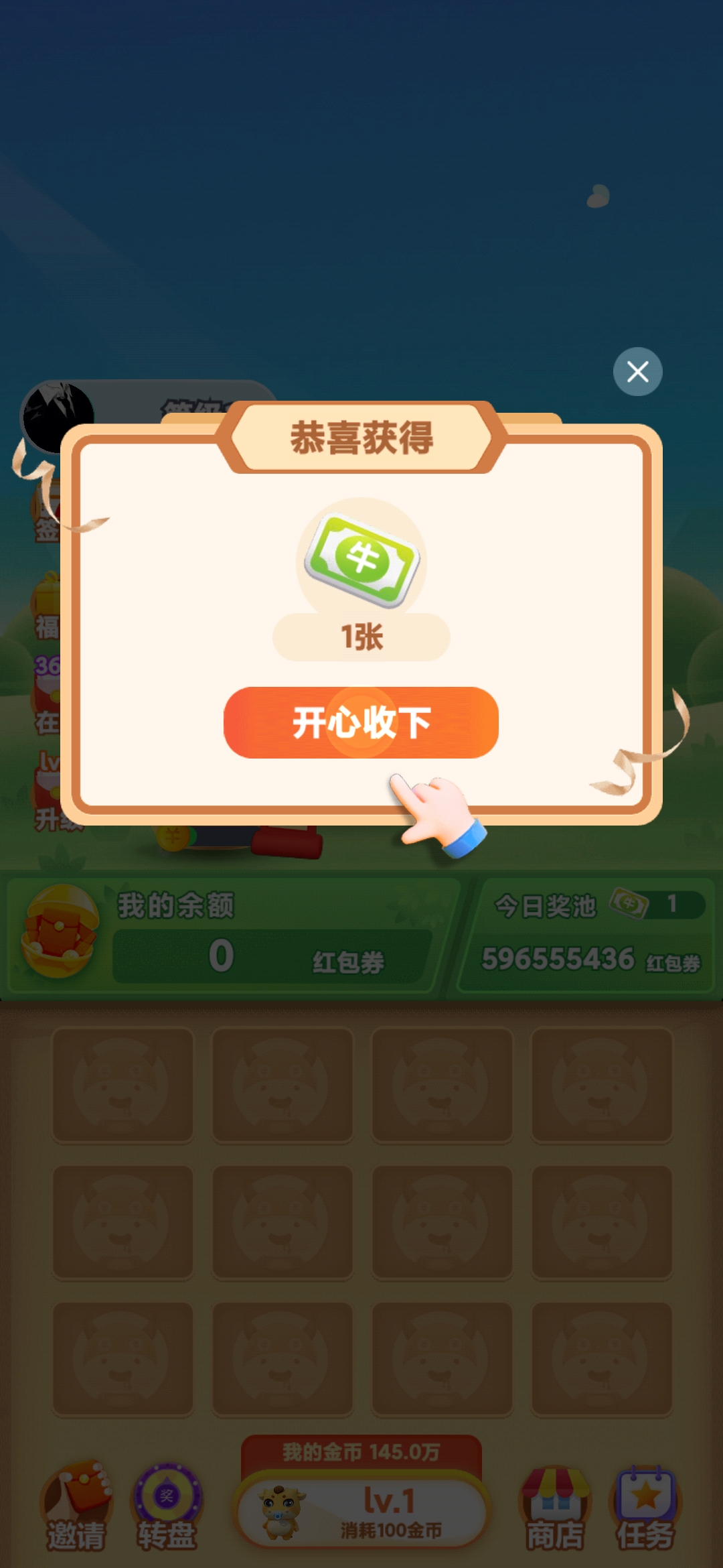 3.点击“开心收下”,随后抽奖。Lv.1-Lv.15,抽奖一次,消耗一张牛票。刚好,我有牛魔王送的一张;