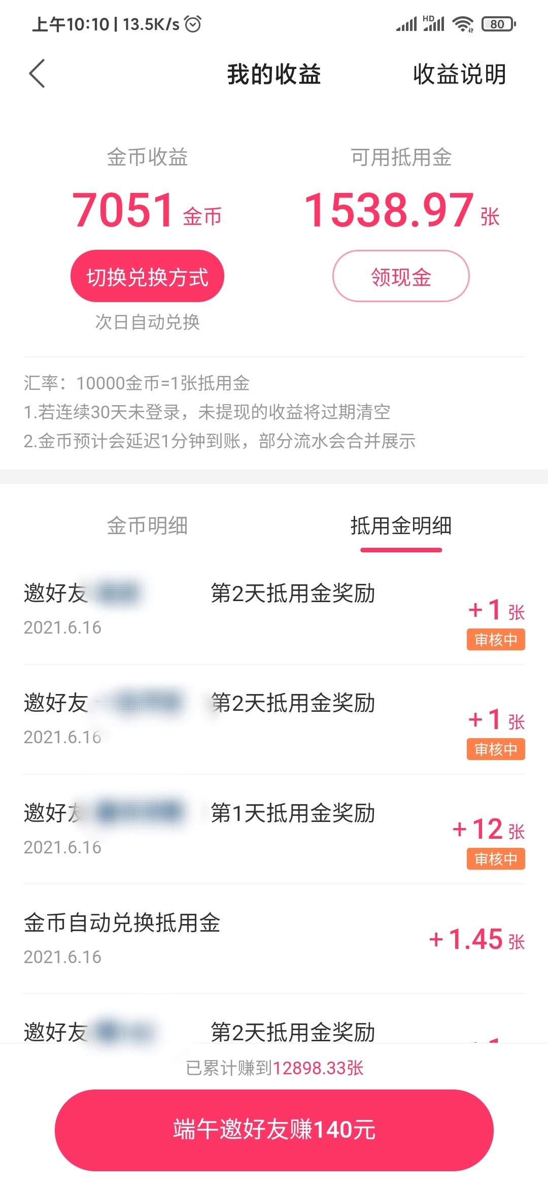 1.在快手极速版,点击“三条杠-去赚钱-可用抵用金(张)”。在抵用金明细中,看到,有的奖励,正在审核中;