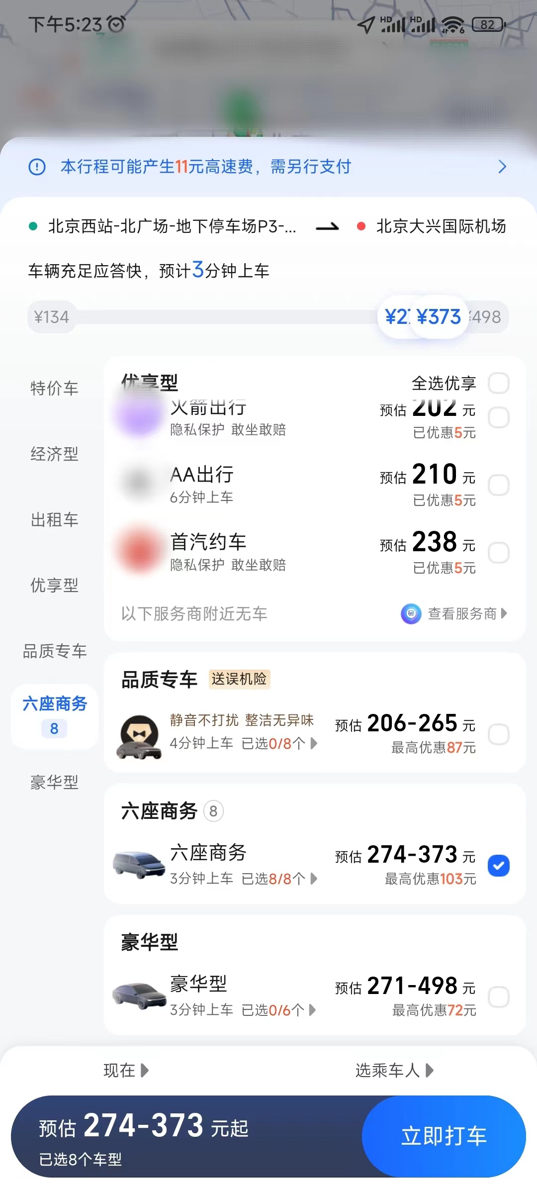 1.在高德打车小程序,选择起点、终点。之后,到车型选择页面。通过点击两次全选,取消默认勾选的车型。下滑页面,找到六座商务。可以全选,或勾选某一车型。选择打车,打座位多的车;