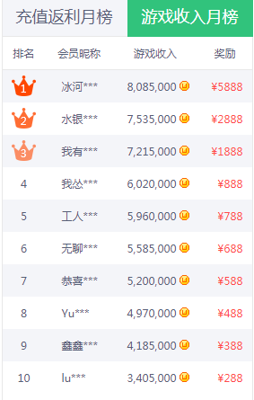 啥?你玩不了网游?那么页游呢?俗称网页游戏,这个就更简单了吧,只要按照平台的要求,把等级升到奖励相应的等级上就能赚钱,啥?玩这个能赚多钱?一个游戏可能不多,第一名奖励2000吧,平台月奖励第一名5888元,在加把劲月收入上万也是有可能的。