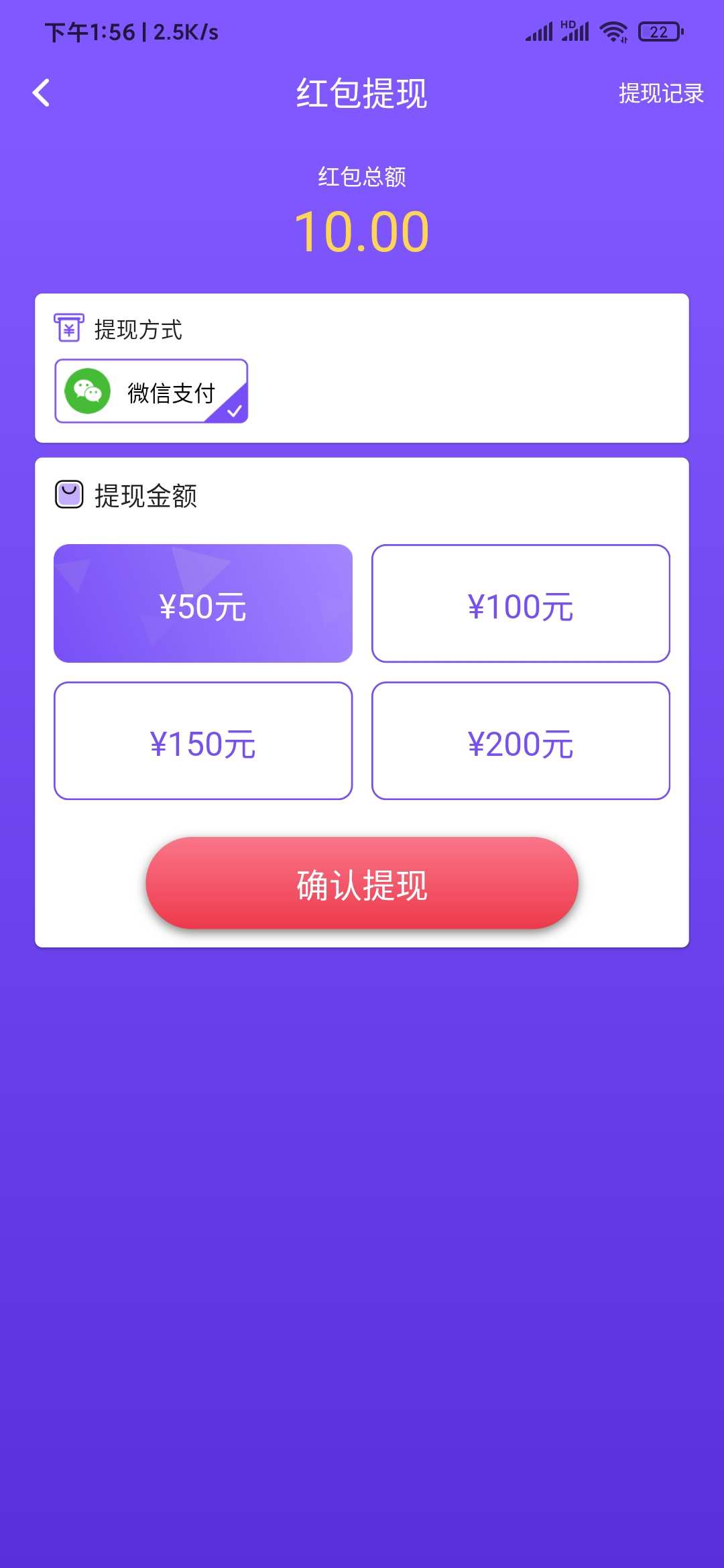目前来说,小编了解后,发现最低是需要满50元才可以发起提现的,提现的金额也一共有四档,最高是200元。当然了,也不要觉得起提金额太高,反过来想,这也说明了大家就能挣到至少50元进行提现了。提现的方式,是到自己的微信钱包账户之中,总的来说,还是挺靠谱而且方便的。
