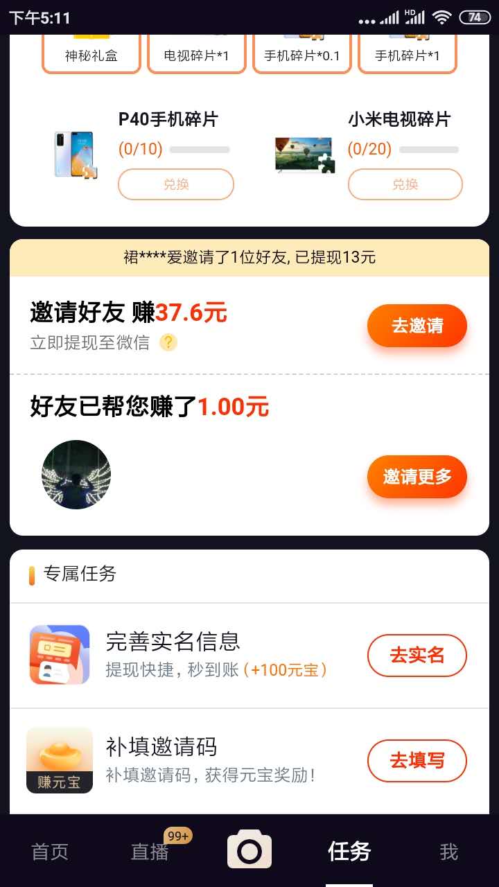 A.点击下方“任务”,在专属任务中,第二栏,就是“补填邀请码”;